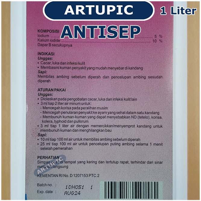 Expired Panjang. Antisep 120 ml adalah sediaan desinfektan/antiseptik yang digunakan untuk membasmi kuman penyakit dalam waktu relatif singkat. lNDlKASl = Unggas : + Cacar, luka dan infeksi kulit + Membasmi kuman penyakit yang mudah menyebar di kandang Sapi : + Membilas ambing sebelum diperah dan pencelupan ambing sesudah diperah KANDUNGAN = + Iodium 5% + Kalium iodide 10% + Dapar B secukupnya ATURAN PAKAI dan DOSIS = Unggas + Dioleskan pada pengobatan cacar, luka dan infkesi kulit lain + 3 ml tiap 2 liter air minum untuk: - Mencegah korisa pada peralihan musim - Mencegah penularan penyakit ke ayam yangs ehat dalam satu kandang - Membunuh kuman-kuman yang dapat menyebabkan ND (tetelo), korisa, kolera, typhoid, pullorum dan koksidiosis + 3 ml tiap 1 liter air dengan memercikkan/menyemprot kandang untuk membunuh kuman dan menghilangkan bau Sapi + 10 ml tiap 100 ml air untuk membilas ambing sebelum diperah + 25 ml tiap 100 ml air untuk pencelupan puting ambing selama 1 menit setelah pemerahan. PERHATIAN = + Simpan obat di tempat yang kering dan tertutup rapat, terhindar dari sinar matahari langsung. KEMASAN = Botol @120 ml KEMENTAN RI No. D 1207153 PTC.2 Produsen = PT. Medion |