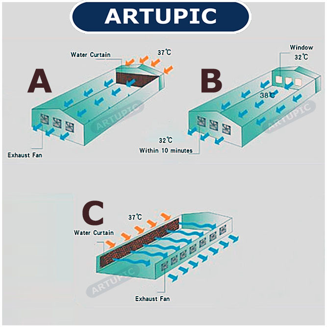 kandang. Mayoritas peternak di Indonesia memasang Exhaust seperti gambar A atau B. Jarang sekali peternak menggunakan gambar C karena nilai investasi akan menjadi lebih besar. |