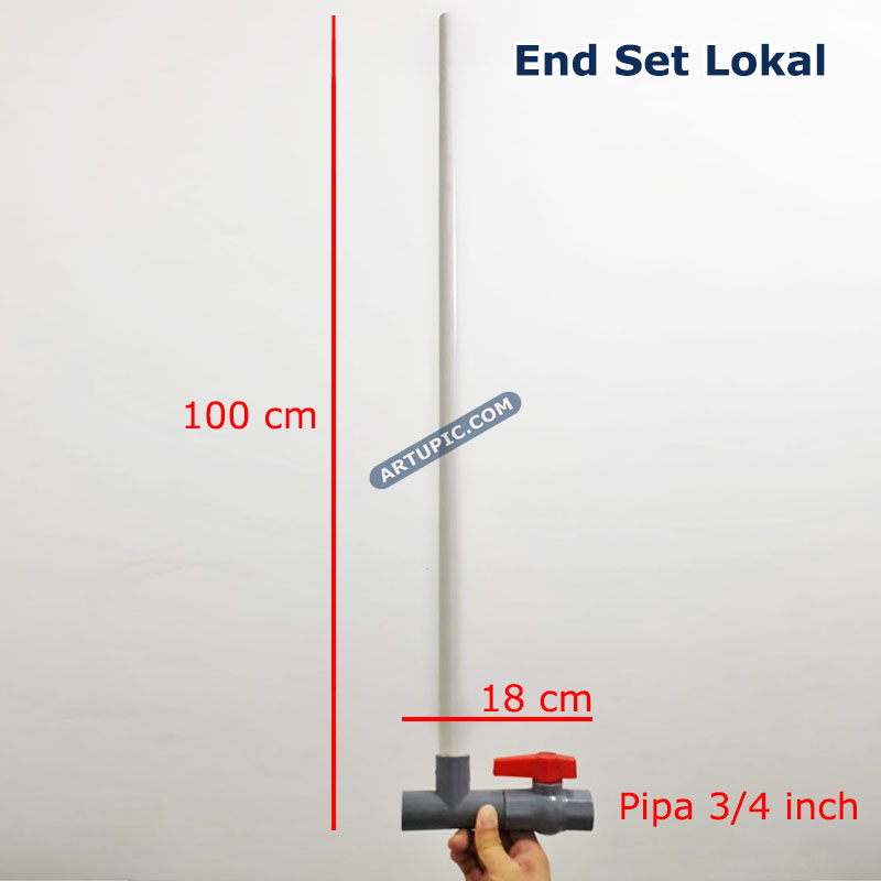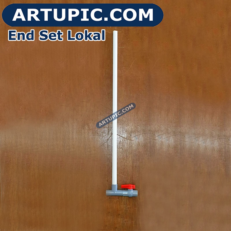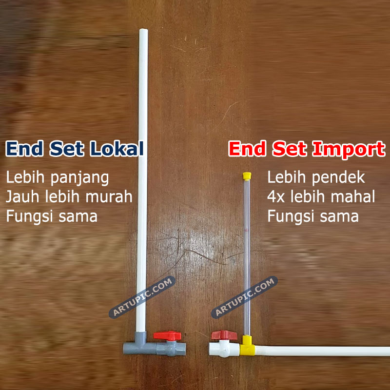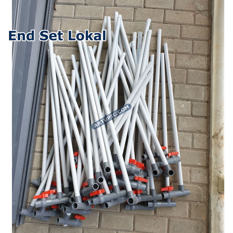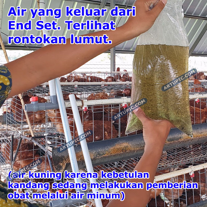 "flusing" atau pembersihan kotoran di dalam pipa. Lubang angin sangat penting untuk menghindari bocor nipple. Kok bisa? Iya karena ketika nipple dipacok ayam, air akan keluar dari nipple dan secara bersamaan udara luar akan masuk ke dalam nipple. Pertanyaan selanjutnya udara yg masuk ke pipa terus keluar kemana? Nah end set ini lah tempat sebagai pintu keluar angin tersebut. Sehingga nipple akan bekerja normal. Jika tidak menggunakan End Set yang akan terjadi adalah angin di dalam pipa semakin lama akan semakin banyak, kemudian angin akan "menendang" gotri pada nipple lain sehingga seolah-olah nipple akan bocor keluar air dengan sendirinya tanpa dipacok. Kita menyebutnya angin batuk. Resiko ke dua jika tanpa End set bisa terjadi angin di dalam pipa semakin banyak akan membuat nipple ketika di pacok tidak mengeluarkan air dengan lancar, karena angin keluar dan angin masuk berebutan mengakibatkan air tidak bergerak. Fungsi lain End set ini adalah untuk Flusing. Yaitu proses pembuangan air agar lumut atau kotoran di dalam pipa bisa keluar terbuang. Sehingga nipple akan terhindar dari mampet. Cara nya mudah hanya buka stop kran dan biarkan air terbuang beberapa menit. Nanti anda akan melihat air yg keluar adalah lumut atau lendir sisa yang mengendap di dalam pipa. Lakukan flusing 15 atau 30 hari sekali.