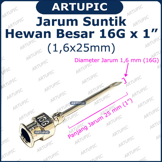 | Jarum diameter lubang 16G cocok untuk hewan besar seperti Sapi, Babi, dan sejenisnya. Semakin besar hewan membutuhkan jarum dengan diameter semakin besar juga.