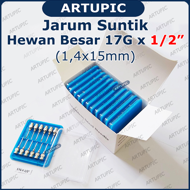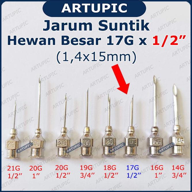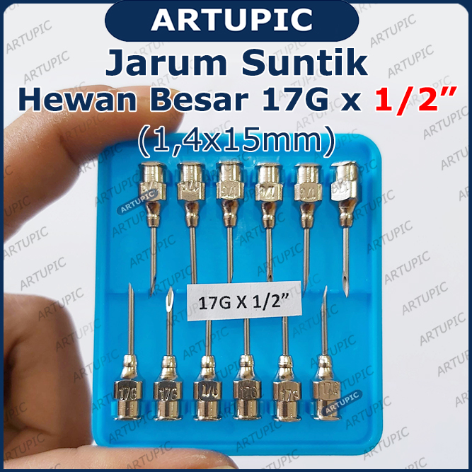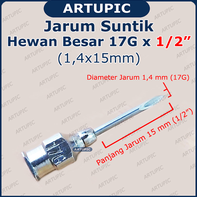 (Tebal 1,4mm. Panjang 15mm). Jarum diameter lubang 17G cocok untuk hewan besar seperti Sapi, Babi, dan sejenisnya. Semakin besar hewan membutuhkan jarum dengan diameter semakin besar juga. Karena hewan besar pasti disuntik dengan cairan yang cukup banyak misalnya 5 ml atau puluhan ml, sehingga butuh jarum diameter besar agar cairan dapat masuk ke tubuh hewan dengan cepat. Karena jika jarum terlalu kecil maka akan sangat lama ketika kita mendorong alat suntiknya, hewan keburu kesakitan dan hewan cenderung akan memberontak. Kita hewan memberontak dan bergerak resikonya tubuh hewan jadi berdarah. Gunakan ukuran jarum 14G-17G untuk hewan besar Anda.