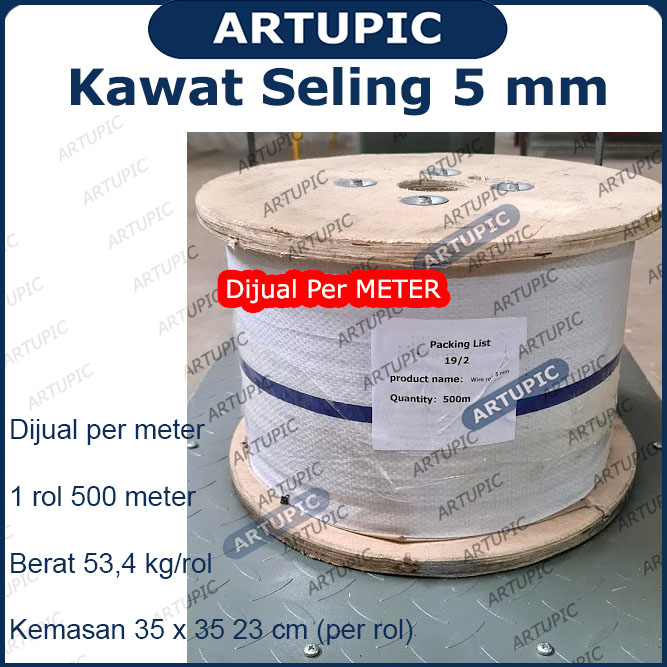 tipe yang berisi benang. Cocok digunakan untuk menarik jalur pipa minum atau pakan pada kandang ternak. Atau kawat seling 5 mm bisa digunakan untuk kebutuhan lainnya juga. Artupic juga menjual kelengkapan lain seperti Kuku macan untuk mengunci kawat, Pulley untuk roda katrol, serta Hand winch untuk pengendali kawat. Silahkan hubungi ARTUPIC untuk konsultasi kebutuhan Anda. Spesifikasi & Kelebihan = HATI-HATI membeli di tempat lain, karena kawat seling banyak yg bagian dalamnya isi BENANG. Sedangkan yg kami jual FULL BAJA IMPORT tidak ada benang sama sekali! Kekuatannya jauh diatas rata2 produk lain. Dari timbangan berat barang bisa terlihat perbedaannya. |