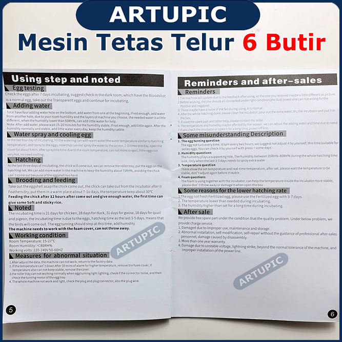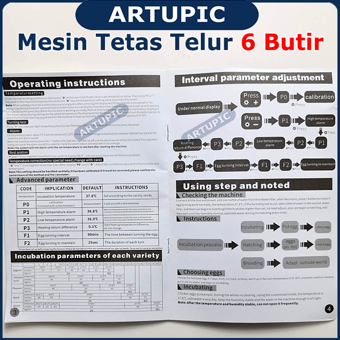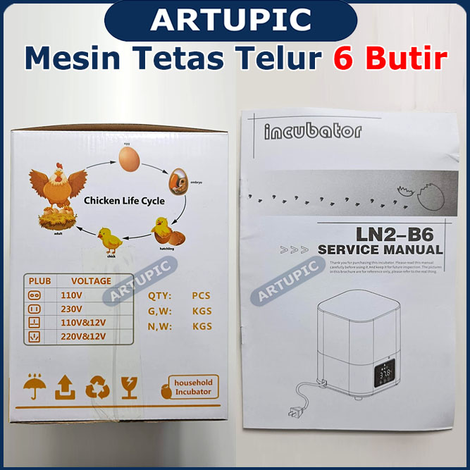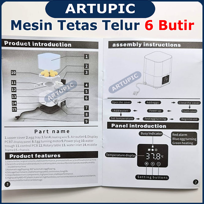 | Mesin Tetas Incubator Telur 6 Butir. Simpel dalam satu clik. Cocok untuk menetaskan telur ayam atau bebek. Mesin bisa diatur suhu derajatnya. Telur berputar 360 derajat otomatis. Full import. Paket berisi = .+ Mesin tetas kapasitas 6 butir .+ Tabung plastik .+ Buku Manual FITUR PRODUK = 1. Menggunakan turbofan, volume udara besar, kinerja stabil, siklus aliran seluruh mesin. 2. Sistem sirkulasi saluran udara yang ilmiah dan masuk akal, suhu dan kelembaban yang lebih seragam di dalam mesin. 3. Pembalik telur otomatis 360 derajat. 4. Rambut kawat panas silika gel, kecepatan pemanasan stabil, terus menerus, umur panjang. 5. Komponen elektronik impor, presisi tinggi, kinerja yang stabil. 6. Bahan plastik ABS + PC berkualitas tinggi, kekerasan tinggi, ketahanan korosi, ketahanan oksidasi, tidak mudah mengalami deformasi dan kerusakan. SPESIFIKASI = Bahan = Plastik Murni Kapasitas = 6 butir telur Dimensi Packing = 20 x 20 x 27 cm Daya = 15 watt Volt = 110V Made in = China |