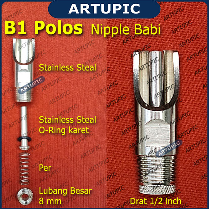 | Nipple minum untuk Babi Kambing Domba. Tahan akan gigitan hewan besar sehingga awet. Debit air yang keluar sangat lancar karena lubang belakang besar. Kecepatan air keluar tergantung ketinggian tower air di kandang. Semakin tinggi tower air maka kecepatan air makin cepat. ARTUPIC adalah peternak babi sejak tahun 2010. Artupic telah makan asam manis dalam mencari pabrik pembuat nipple terbaik dari China. Sehingga sekarang produk yang kami sediakan adalah produk yang telah mengalami uji praktek di lapangan. Kami paling paham dan ahli dalam hal nipple babi ini. Kami mengetahui kebutuhan Anda! Spesifikasi & Kelebihan = + Stainless Steal middle (terlihat sama stainless tapi beda kualitas dibanding tipe B1) + Tipe = B1 Polos + Non Garansi + Non Bonus per karet |