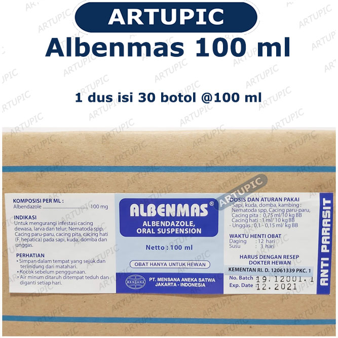 Obat ini dikonsumsi lewat mulut. Albendazole bekerja dengan merusak sel di usus cacing, sehingga cacing tidak dapat menyerap gula, serta kehabisan energi dan mati. lNDlKASl = Mengurangi infestasi cacing dewasa, larva dan telur, Nematoda spp., cacing paru-paru, cacing pita, cacing hati (F. hepatica) pada sapi, kuda, domba dan unggas. KANDUNGAN per ml = Albendazole 100 mg ATURAN PAKAI dan DOSIS = (Oral) - Sapi Kuda Domba = Nematoda spp, cacing paru-paru, cacing pita : 0,75 ml/10 kg BB Cacing hati: 1 ml/10 kg BB - Unggas: 0,1-0,15 ml/kg BB - Waktu Henti Obat = Daging 12 hari. Susu 3 hari. PERHATIAN = .+ Kocok sebelum penggunaan .+ Simpan obat ditempat sejuk dan terlindung dari sinar matahari. .+ Harus dengan resep dokter hewan. .+ Obat hanya untuk hewan KEMASAN = Botol 100 ml (1 dus isi 30 botol @100 ml) Produsen = PT. Mensana Aneka Satwa #obatcacingayam #mensana #albenmas #albendazole #obatcacingternak #obatlarva #cacinglarva #cacinghati #giardiasis #trichuriasis #filariasis #neurosistiserkosis #echinococcosis #enterobiasis #askariasis #obatcacingsapi #obatcacingkambing #obatcacingdomba #artupic #obatayam #obatternak #obatunggas #ayam #ayammerah #ternak #hewan #hewanpeliharaan #hewanpiaraan #hewanternak #peternakan #peternak #perlengkapanhewan #keperluanhewan #hewanternak |
