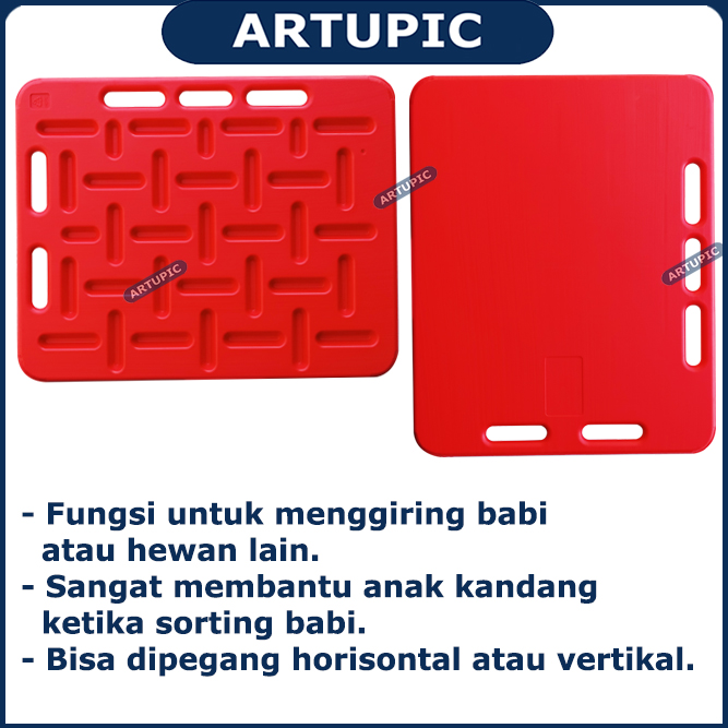 | Papan Penghalang Babi 94x76x3 cm Pig Panel Board. Fungsi untuk menggiring babi atau hewan lain. Sangat membantu anak kandang ketika sorting babi. Bisa dipegang horisontal atau vertikal. Material HDPE sangat tebal dan aman. Sudah bersertifikat ISO9001. Produk bertaraf International sudah banyak digunakan di peternakan besar di luar negeri. Jika Anda membeli sekarang maka Anda peternak Indonesia pertama yang memanfaatkan kepraktisan produk ini!