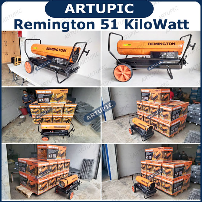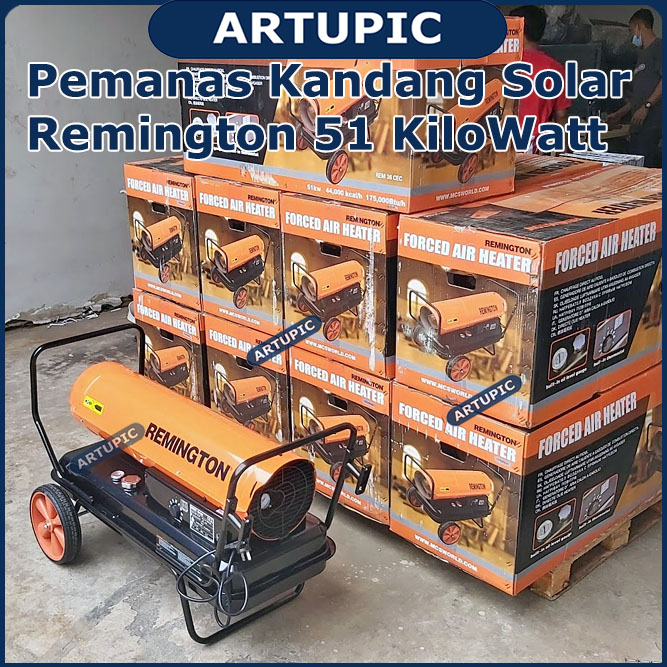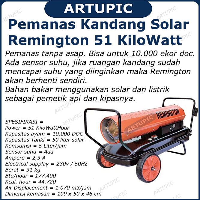 | Remington 51 KW Pemanas Kandang Solar. Adalah pemanas tanpa asap. Kapasitas 1 Unit Remington bisa untuk 10.000 ekor doc. Ada sensor suhu, jika ruangan kandang sudah mencapai suhu yang diinginkan maka Remington akan berhenti sendiri. Bahan bakar menggunakan solar dan listrik sebagai pemetik api dan kipasnya. Spesifikasi & Kelebihan = + Power = 51 KWH + Kapasitas ayam = 10.000 DOC + Kapasitas Tanki = 50 liter solar + Komsumsi = 5 Liter/jam + Sensor suhu = Ada + Ampere = 2,3 A + Electrical supplay = 230v / 50Hz + Berat = 31 kg + Btu/hour = 177.400 + Kcal. hour = 44.720 + Air Displacement = 1.070 m3/jam + Dimensi kemasan = 109 x 50 x 46 cm |