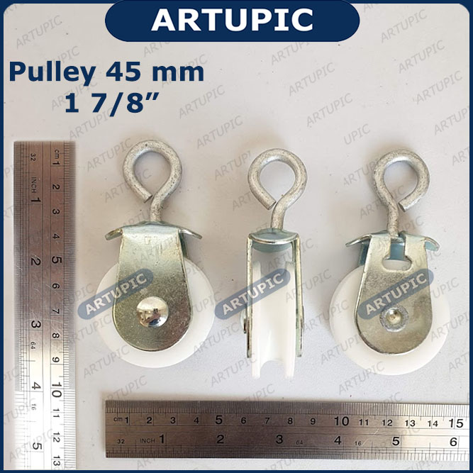 | Pulley Katrol 45 mm 1 7 per 8 Inch dengan kapasitas 15 kg. Biasa digunakan untuk gantung nipple kandang, disambungkan dengan kawat selling atau bisa juga tali tambang kecil.