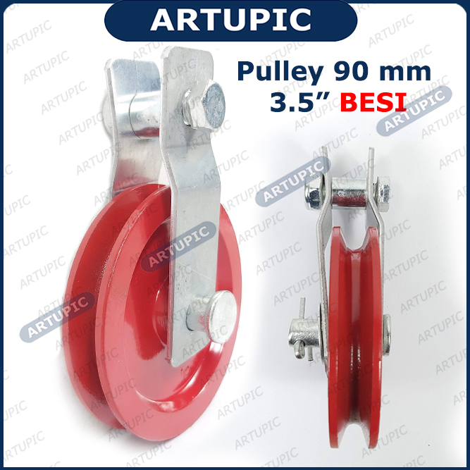 | Pulley Katrol 90 mm 3.5 inch terbuat dari BESI. Kapasitas 100 kg atau lebih. Biasa digunakan untuk gantung nipple kandang, gantung terpal, kemudian disambungkan dengan kawat selling atau bisa juga tali tambang kecil. |